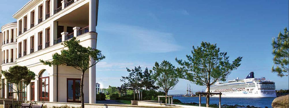 Die einzigartige Lage der Yachthafenresidenz Hohe Düne – fast vollständig von Wasser umgeben – bietet phantastische Ausblicke auf das Kreuzfahrtterminal, den Yachthafen und das offene Meer.